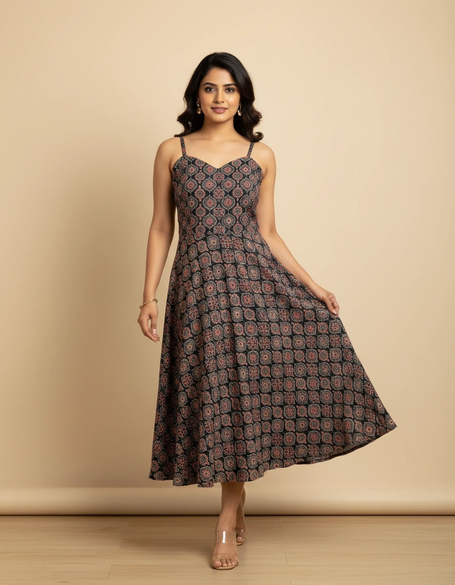 This ajrakh prited pure cotton dress makes a great addition to your wardrobe for casual wear with this evergreen design .