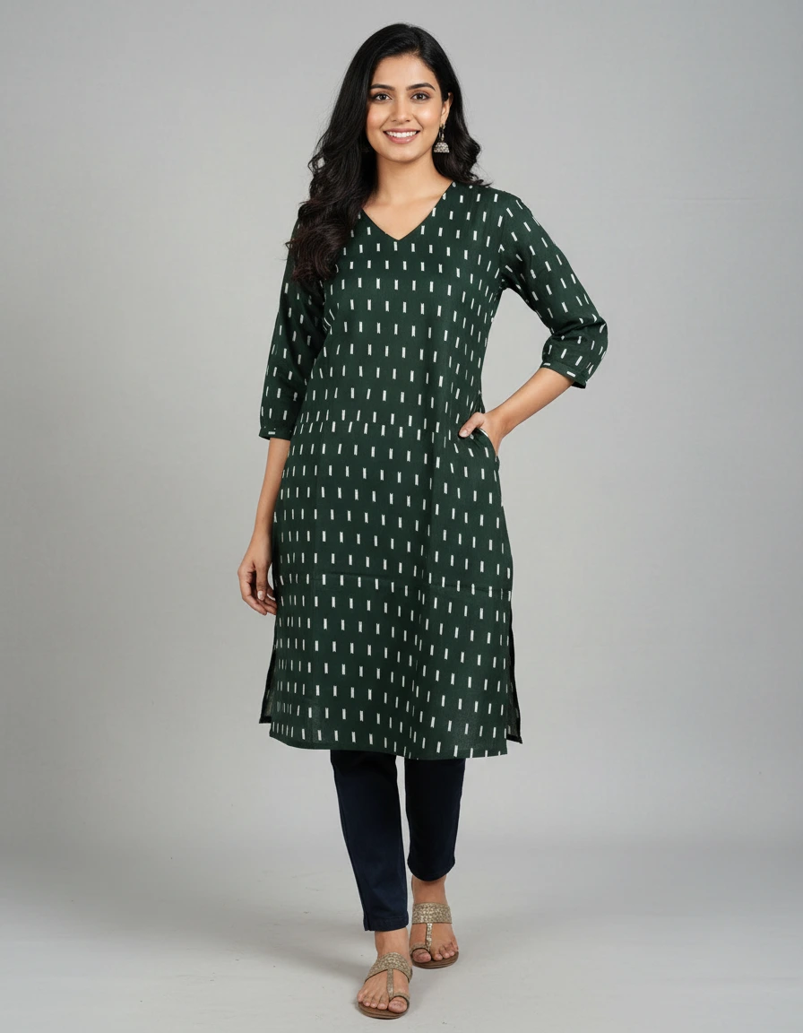 This Ikat Print Green Pure Cotton Kurta makes a great addition to your wardrobe for casual wear with this evergreen design .